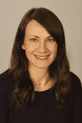 Eine Frau mit langen braunen Haaren und heller Haut lächelt in die Kamera. Sie trägt ein schwarzes Oberteil und eine dünne Halskette. Der Hintergrund ist einfarbig hell.